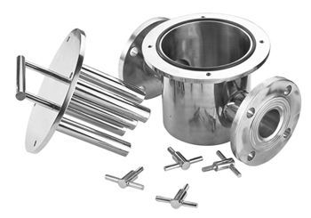 管道強磁除鐵器(簡稱除鐵器),用于清除鐵質污染物(如鐵銹、鐵屑)和其它細小的鐵磁性雜質,可有效提高生產(chǎn)線上的產(chǎn)品純度,保護關鍵設備免受鐵質顆粒的破壞。除鐵器采用三維有限元分析法進行的磁棒磁路及分布設計。整機為全不銹鋼結構材料。其核心磁棒為工藝生產(chǎn)的釹鐵硼材料,表面磁場強度峰值大于12000高斯。磁棒和連接件之間采用連續(xù)不銹鋼焊接。上蓋可采用快開式或衛(wèi)生卡箍設計。